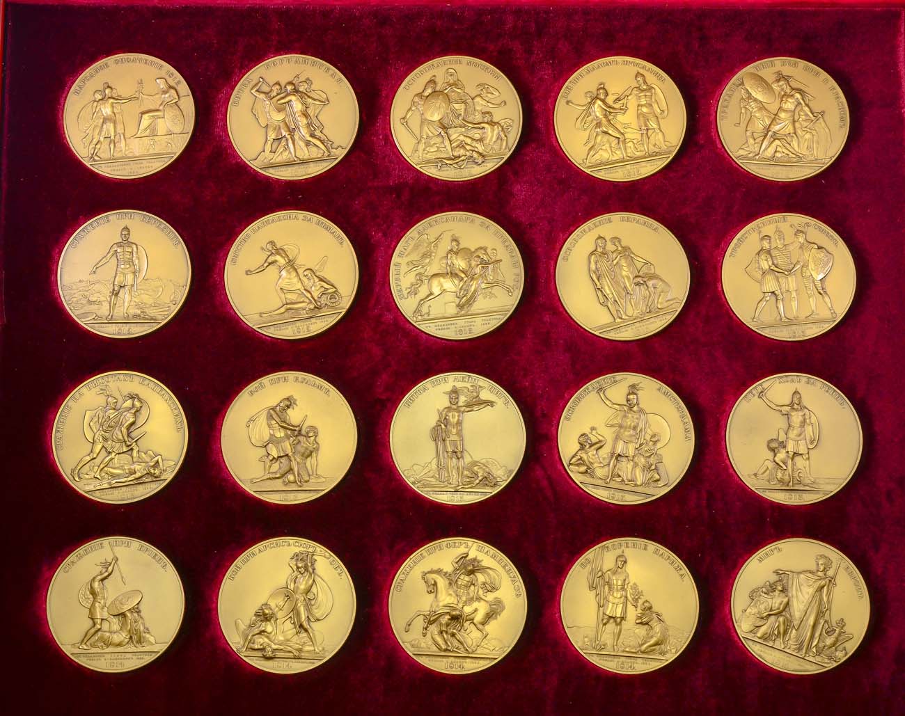 Томпак. 1. Медаль. Диаметр 70 мм. Санкт-Петербургский монетный двор. Аверс: малый государственный герб Российской Империи образца 1810-1825 гг в круговой надписи "200 лет победе в Отечественной войне 1812 года". Реверс: вид на резиденцию президента Российской Федерации в Московском Кремле, под ним надпись "ОТ ПРЕЗИДЕНТА РОССИЙСКОЙ ФЕДЕРАЦИИ 1812-2012", на три часа "СПМД". 2. Набор из 20 медалей по медальонам графа Федора Петровича Толстого (1783-1873 гг.). Диаметр 70 мм. Санкт-Петербургский монетный двор. Аверс: портрет Александра I в виде славянского бога храбрости, мудрости и правосудия – Родомысла, в круговой надписи "РОДОМЫСЛЪ ДЕВЯТОГО НА ДЕСЯТЬ ВЕКА", на три часа "СПМД". Реверс: 1. Народное ополчение 1812; 2. Бородинская битва; 3. Освобождение Москвы; 4. Бой при Малом Ярославце; 5. Трехдневная битва при Красном; 6. Сражение при Березине; 7. Бегство Наполеона за Неман; 8. Первый шаг Александра за пределы России; 9. Освобождение Берлина; 10. Тройственный союз; 11. Сражение на высотах Кацбахских; 12. Битва при Кульме; 13. Битва при Лейпциге; 14. Освобождение Амстердама; 15. Переход за Рейн; 16. Сражение при Бриене; 17. Бой при Арсис – сюр – обе; 18. Битва при Фершампенуаз; 19. Покорение Парижа; 21. Восстановление мира в Европе. UNC.