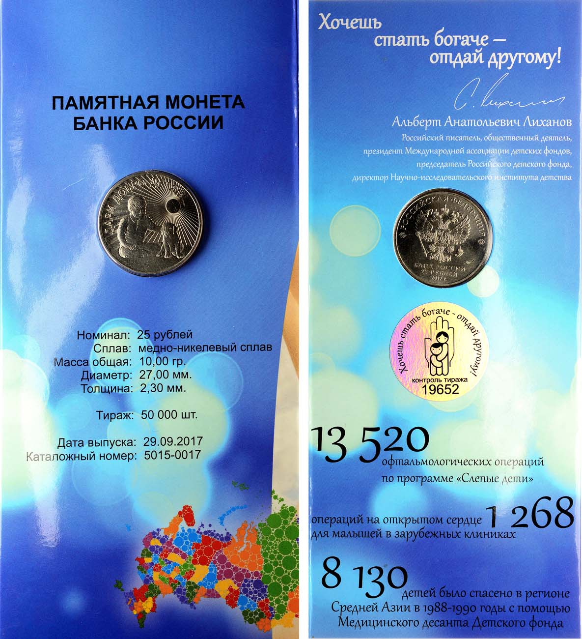 Выпуск 25 рублей "Дари добро детям" - это часть благотворительной акции, организованной "Российским детским фондом". Этот памятный денежный знак является официальным платежным средством, но все же он не предназначался для денежного оборота. Получить его могли только лица, которые сделали пожертвования на сумму 5 тысяч рублей в одном из банков, участвовавших в акции.