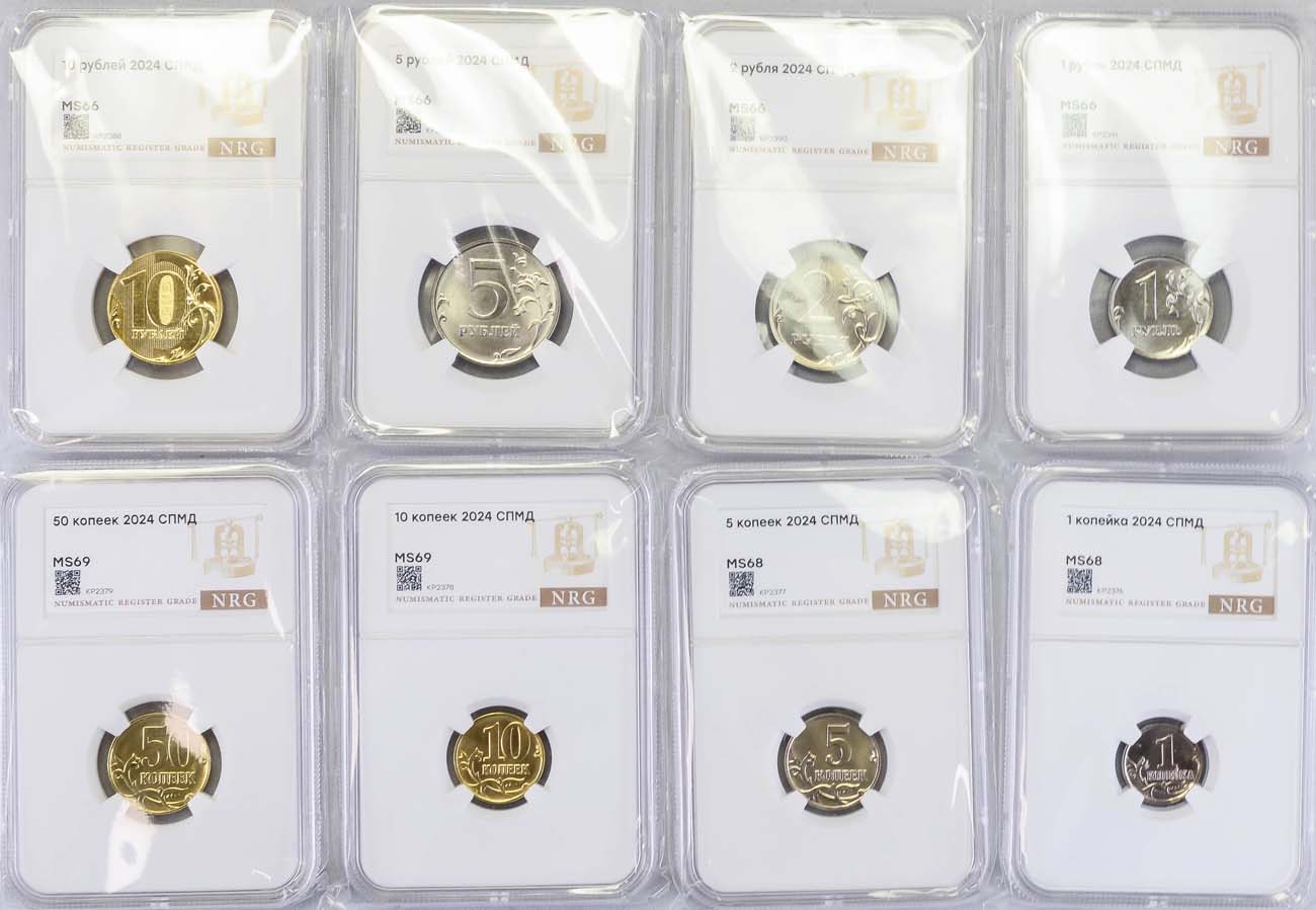 1 копейка 2024 года. СПМД. NRG MS68. 5 копеек 2024 года. СПМД. NRG MS68. 10 копеек 2024 года. СПМД. NRG MS69. 50 копеек 2024 года. СПМД. NRG MS69. 1 рубль 2024 года. СПМД. NRG MS66. 2 рубль 2024 года. СПМД. NRG MS66. 5 рублей 2024 года. СПМД. NRG MS66. 10 рублей 2024 года. СПМД. NRG MS66. MS66 - MS69.