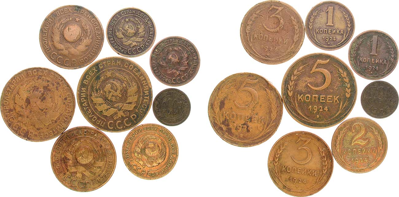 Медь. 5 копеек 1924 года (гурт гладкий) 2 штуки. 3 копейки 1924 года (гурт гладкий). 2 штуки. 2 копейки 1924 года (гурт рубчатый). 1 копейка 1924 года (гурт рубчатый) 2 штуки. Полкопейки 1925 года. F/XF.