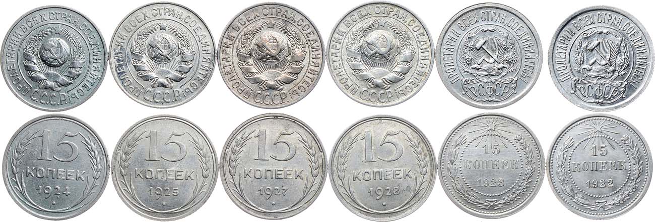 Серебро. 15 копеек 1922 года. 2,66 г. AU/UNC. 15 копеек 1923 года. 2,65 г. AU/UNC. 15 копеек 1924 года. 2,66 г. AU. 15 копеек 1925 года. 2,62 г. AU/UNC. 15 копеек 1927 года. 2,70 г. AU. 15 копеек 1928 года. 2,73 г. AU/UNC. AU/UNC.