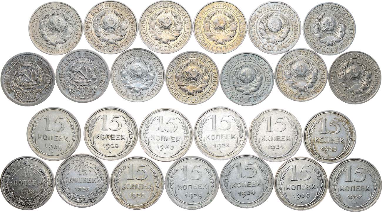 Серебро. 15 копеек 1922 года (2 шт.), 15 копеек 1923 года (2 шт.), 15 копеек 1924 года (2 шт.), 15 копеек 1925 года (2 шт.), 15 копеек 1927 года, 15 копеек 1928 года (2 шт.), 15 копеек 1929 года (2 шт.), 15 копеек 1930 года (2 шт.). VF-AU.