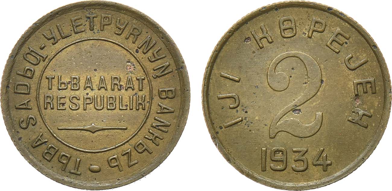 Бронза. 2г. Тувинская народная республика. Тиражный выпуск 1934 года. ФедоринVI 45-РДЗ (150 у.е.). AU/UNC.