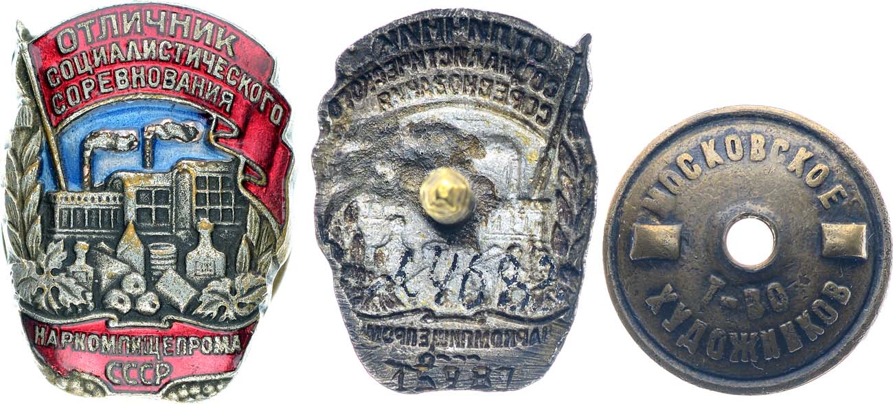 Бронза, серебрение, эмаль. 13,85г. Размеры 30х21 мм. СССР, Московское товарищество художников, 1940-е гг. Надпись на гайке "Московское / Т-во / Художников". Реверс: гравировка номера "15987". AU/UNC.