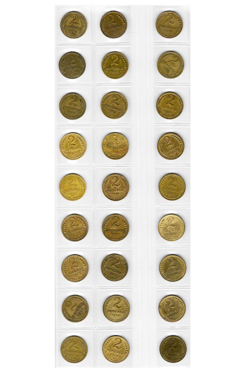 Алюминиевая бронза. 2 копейки 1926 года, 1928, 1929, 1930, 1931, 1932, 1933 (10 у.е.), 1934, 1935 (старый тип), 1936, 1937, 1938, 1939, 1940, 1941, 1945, 1946, 1948, 1949, 1950, 1951, 1952, 1953, 1954, 1955, 1956, 1957 года. XF/UNC.