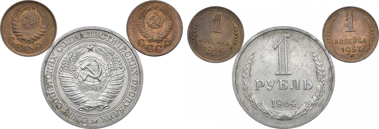 1 копейка 1946 года. Алюминиевая бронза. 1,01 г. Федорин VI 99. XF+/AU. 1 копейка 1957 года. Алюминиевая бронза. 0,94 г. Федорин VI 127. UNC. 1 рубль 1964 года. Медно-никелевый сплав. 7,58 г. Федорин VI 14. AU. XF/UNC.