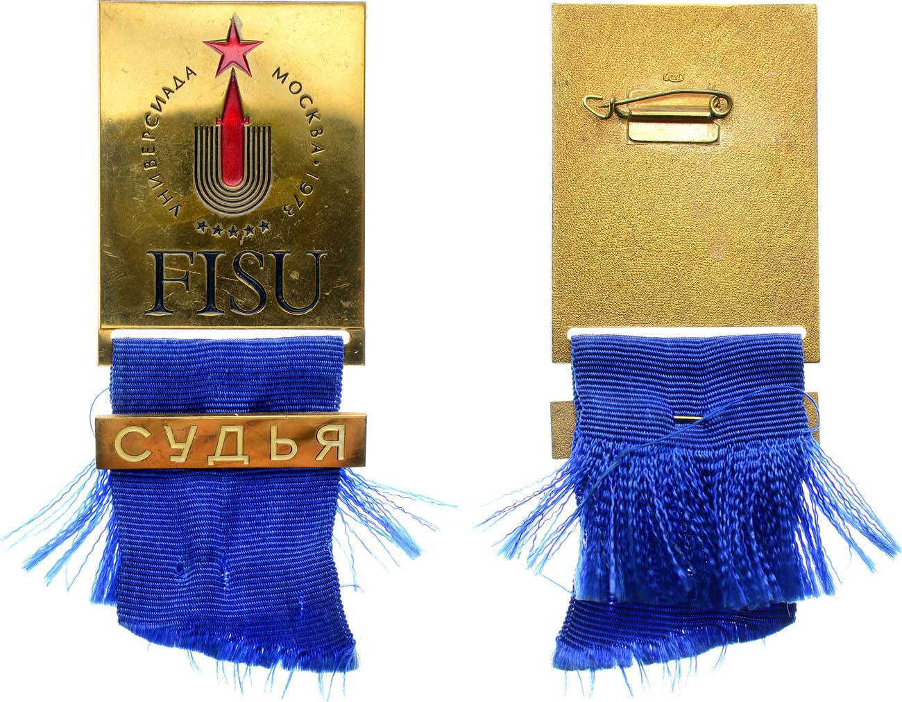 Бронза, эмаль. 39,42г. Размеры 50х40 мм. Ленинградский монетный двор. На булавке, с синей муаровой лентой с плашкой "СУДЬЯ". UNC.
