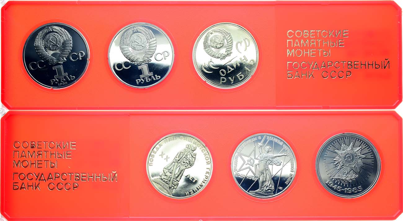 Медно-никелевый сплав. 1 рубль 1965 года. ХХ лет Победы над фашистской Германией. Медно-никелевый сплав. 9,61 г. Ленинградский монетный двор. PROOF. 1 рубль 1975 года. 30 лет Победы в Великой Отечественной войне. Медно-никелевый сплав. 12,78 г. Ленинградский монетный двор. PROOF. 1 рубль 1985 года. 40 лет победы советского народа в Великой Отечественной войне. Медно-никелевый сплав. 12,74 г. Ленинградский монетный двор. PROOF. PROOF.