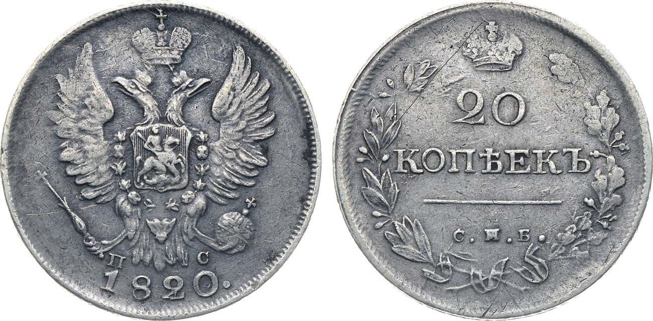 Серебро. 4,12г. Аверс: последние цифры года "20" перегравирована из "19" на штемпеле. Реверс: за первым звеном лавровой ветки 2 ягоды, за первым звеном дубовой 1 жёлудь. Уздеников 1462. Биткин 200. Конрос 1910. XF+.