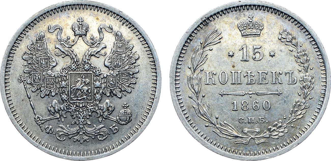 15 копеек 1860 года с орлом регулярного чекана встречаются значительно реже, чем с "особым" орлом.