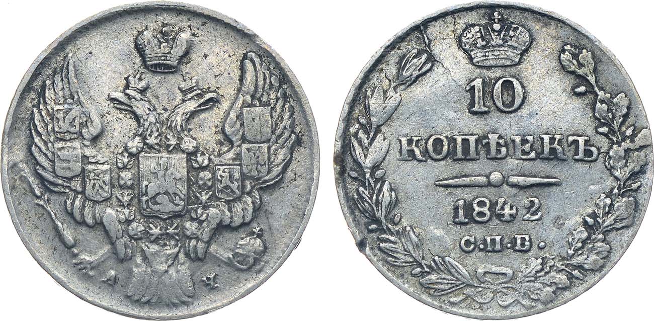 Серебро. 2,02г. Тираж: 300.000 экз. Аверс: корона узкая. Реверс: цифры года расставлены "184 2". Уздеников 1612. Биткин 362. Конрос 2250 (+). AU 50.