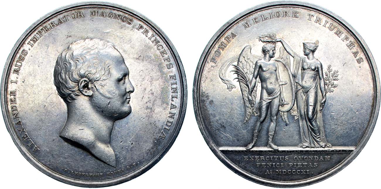 Серебро. 62,38г. Диаметр 55 мм. Санкт-Петербургский монетный двор. Медальер К. Леберехт (аверс: под портретом "C. LEBERECHT EQUES &. F.", реверс: на линии обреза "C. LEBERECHT EQ. ORD. ST.AN. 2 CL. CONSS. STA. F."). Reichel 3217(R1). Дьяков 345.1(R3). AU.