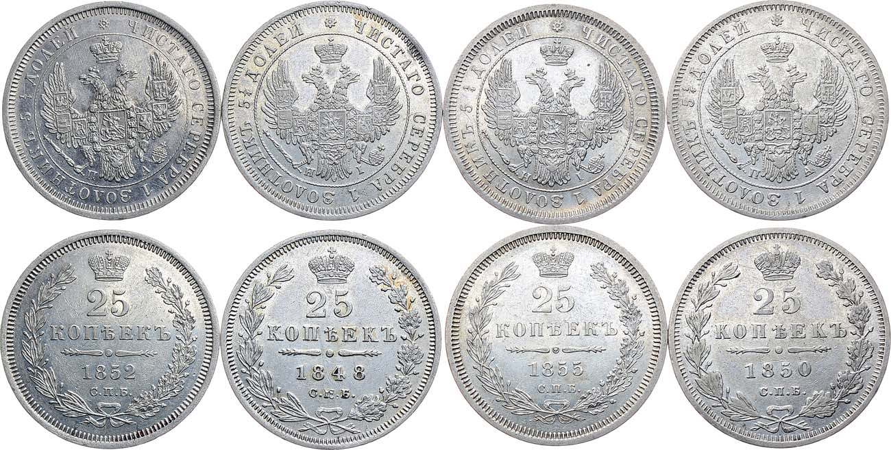 Серебро. 25 копеек 1848 года СПБ-HI. Аверс: Орел 1850-1855. Биткин 298. XF+. 25 копеек 1850 года СПБ-ПА. Биткин 301. AU. 25 копеек 1852 года СПБ-ПА. Реверс: Узкая корона. Биткин 304. AU. 25 копеек 1855 года СПБ-HI. Биткин 311. AU.