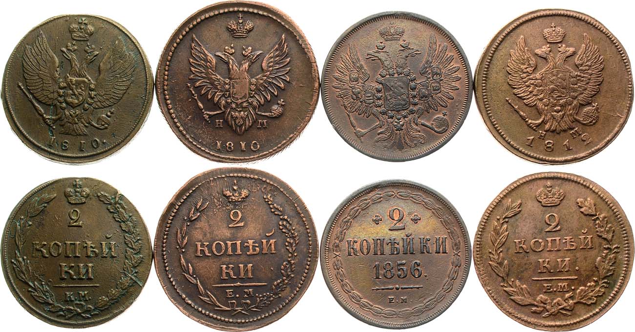 Медь. 2 копейки 1810 года. КМ. 13,21 г. 2 копейки 1810 года. ЕМ-НМ. 14,78 г. 2 копейки 1812 года. КМ. 13,16 г. 2 копейки 1856 года. ЕМ. 10,77 г. XF/AU.