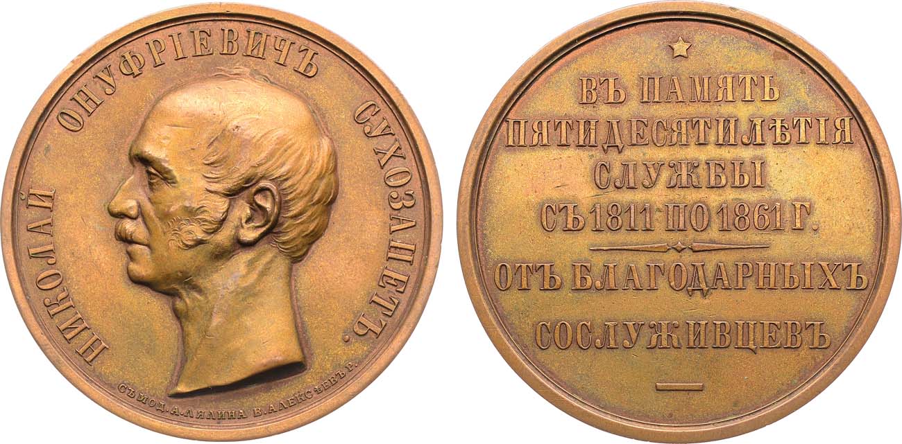 Бронза. 49,13г. Диаметр 51 мм. Санкт-Петербургский монетный двор. Медальер В. Алексеев (на аверсе, под бюстом "СЪ МОД. A . ЛЯЛИНА В . АЛЕКСѢЕВЪ P." (С модели А. Лялина В. Алексеев резал). Реверс: надпись в шесть строк "ВЪ ПАМЯТЬ | ПЯТИДЕСЯТИЛѢТIЯ | СЛУЖБЫ | СЪ 1811 ПО 1861 Г . | - | ОТЬ БЛАГОДАРНЫХЪ | СОСЛУЖИВЦЕВЪ | - |". Смирнов 642. Иверсен Persons DLXXIV. Дьяков 701.1(R0). AU.
