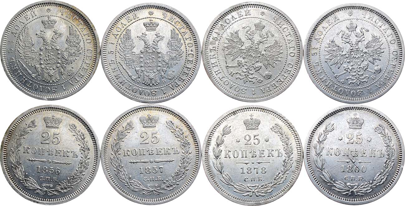 Серебро. 25 копеек 1856 года СПБ-ФБ. Биткин 54. AU/UNC. 25 копеек 1857 года СПБ-ФБ. Биткин 55. AU/UNC. 25 копеек 1860 года СПБ-ФБ Аверс: Св. Георгий без плаща. Биткин 34. XF+/AU. 25 копеек 1878 года СПБ-НФ. Биткин 156. AU/UNC. XF/UNC.