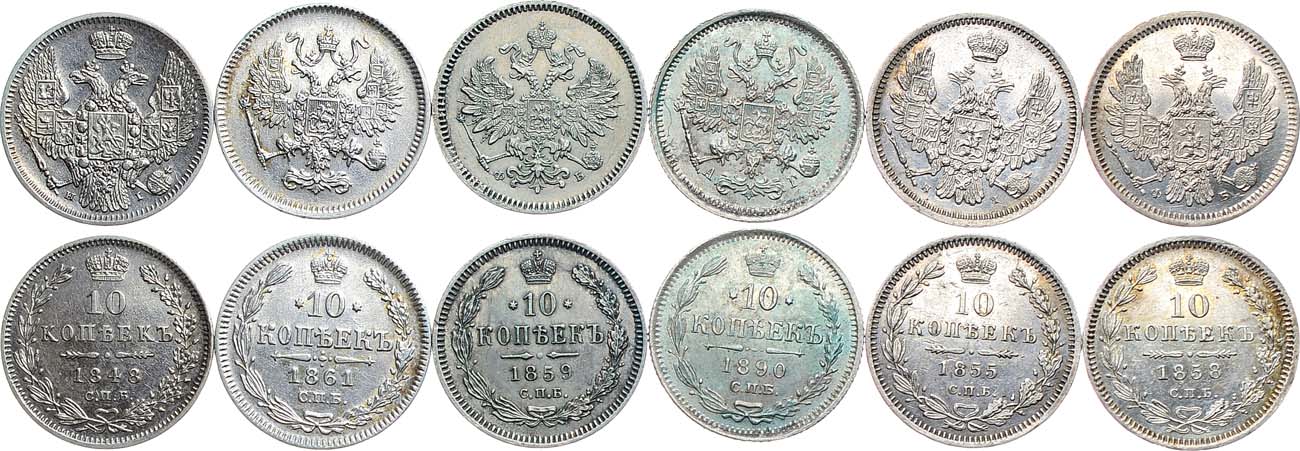 Серебро. 10 копеек 1848 года. СПБ-НI. 2,02 г. 10 копеек 1855 года. СПБ-НI. 2,05 г. 10 копеек 1858 года. СПБ-ФБ. 2,1 г. 10 копеек 1859 года. СПБ-ФБ. 2,07 г. 10 копеек 1861 года. СПБ. 2,04 г. 10 копеек 1890 года. СПБ-АГ. 1,8 г. AU/UNC.