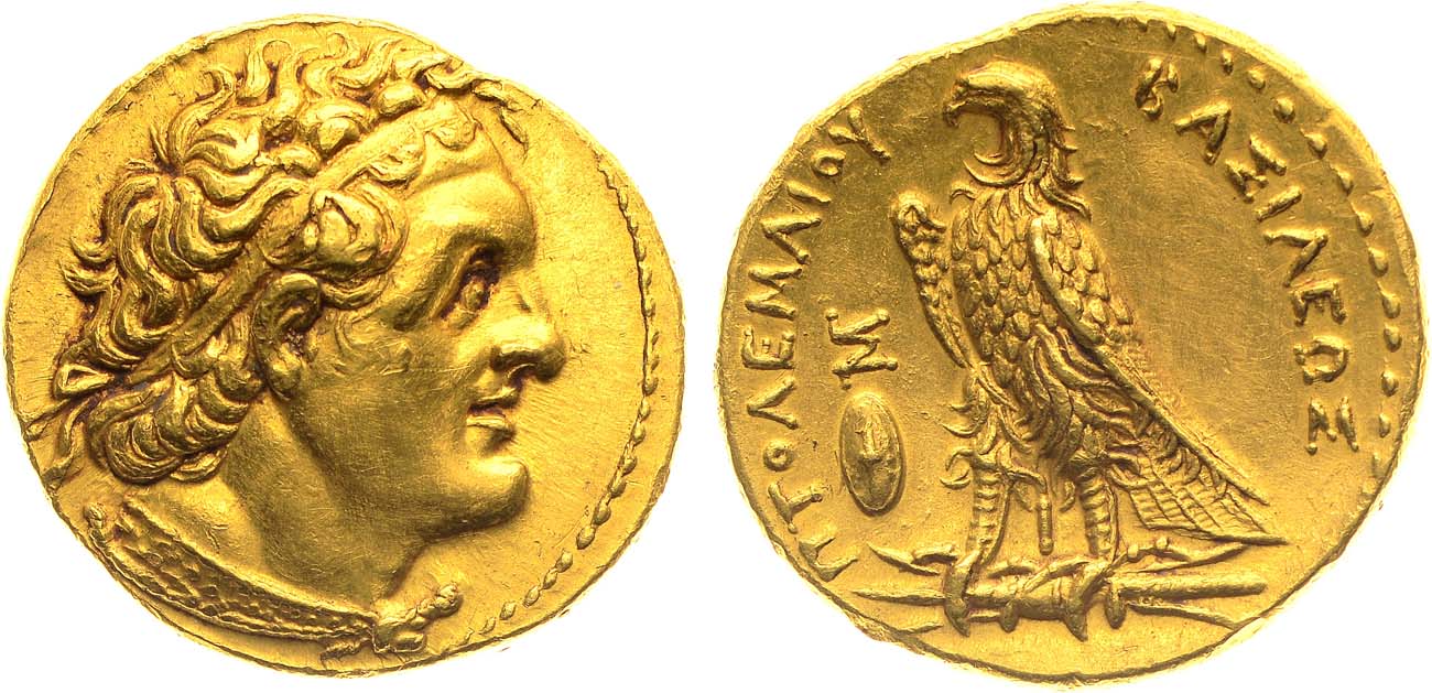 Золото. 17,8г. Александрия. Аверс: голова Птолемея I с диадемой вправо, острие завязано на шее, в точечном ободке. Реверс: "ΠΤΟΛΕΜΑΙΟΥ-ΒΑΣΙΛΕΩΣ", орел на молнии, с закрытыми крыльями влево;"М" над щитов в поле слева, в точечкном ободке. AU/UNC.