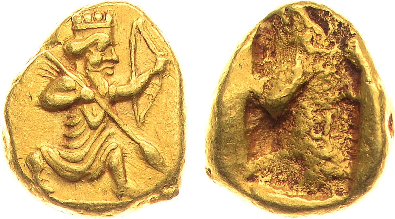 Золото. 8,35г. Аверс: персидский царь, облаченный в канди и кидарис, с луком и копьём в руках. AU.