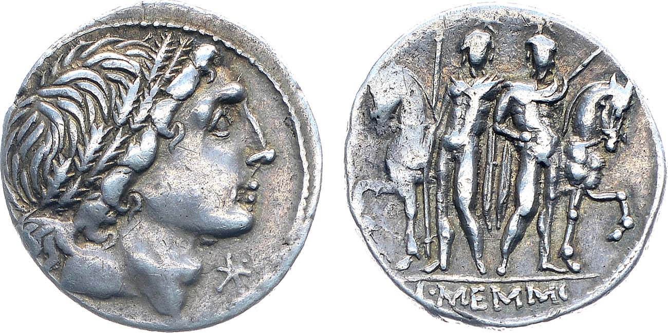 Серебро. 3,8г. Рим. Аверс: мужская голова в дубовом венке вправо; знак номинала перед ней. Реверс: Диоскуры стоят лицом к лошадям, каждый держит копьё; под линией обреза надпись "L MEMMI". Crawford 304/1. Sear 181. XF.