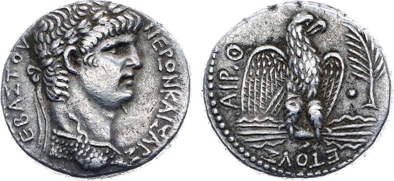 Серебро. 14,77г. Антиохия на Оронте. Аверс: "NEPΩN KAIΣAPΣ-EBAΣTOΣ" драпированный бюст императора вправо. Реверс: "ETOYΣ", орёл на молнии, с распростёртыми крыльями вправо; справа — ядро и пальмовая ветвь, слева — AIP•I (дата). RPC I 4186. XF.