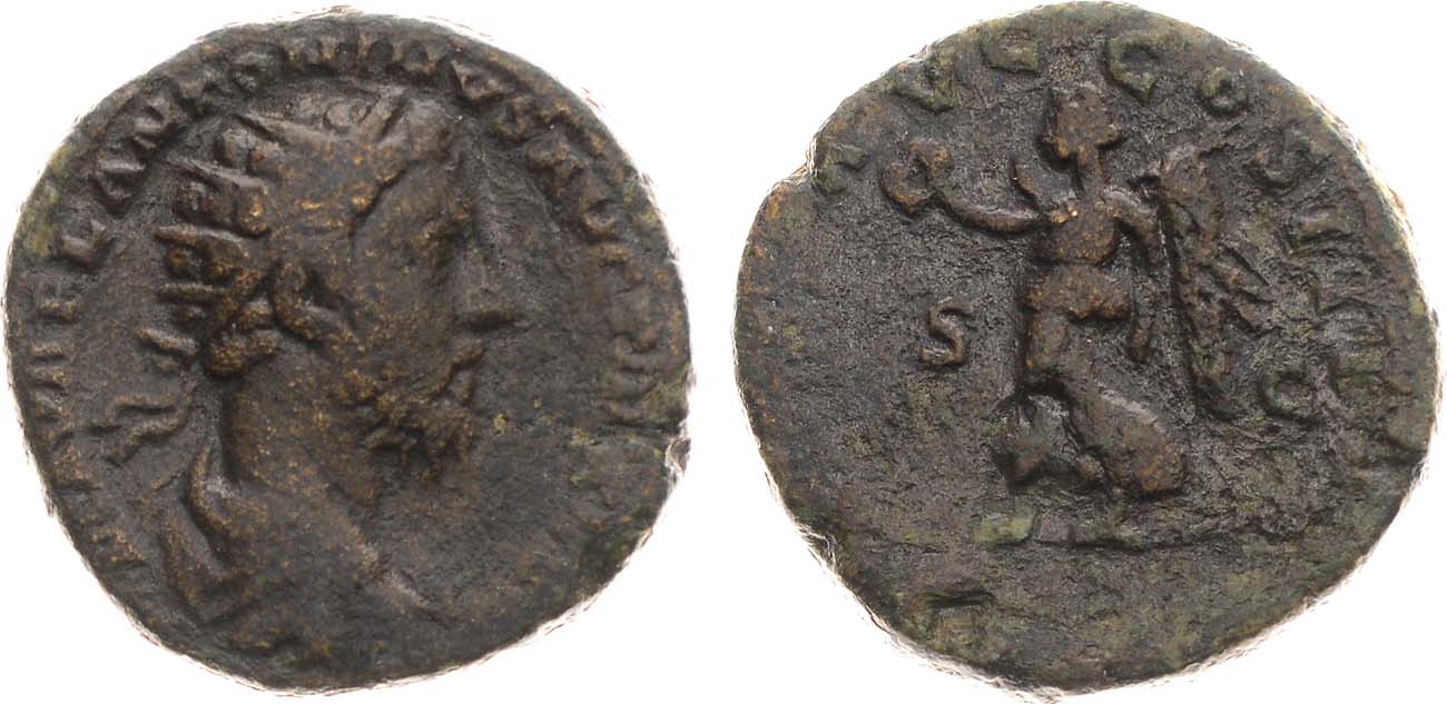 Бронза. 12,18г. Рим. Бюст императора в лучистой короне вправо "M AVREL ANTONINVS AVG TR P XXXIII". Реверс: "IMP X COS III P P" Богиня Виктория влево, в руках венок и пальмовая ветвь, по сторонам "S C". Sear 5036. VF.