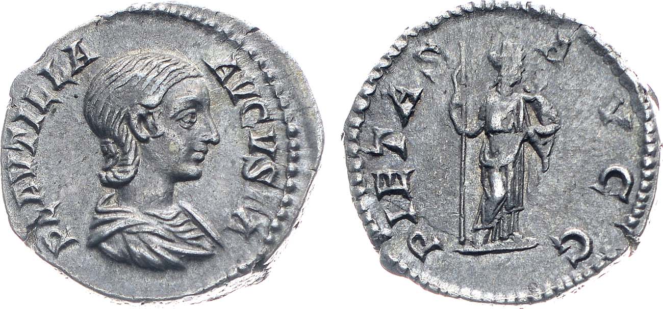Серебро. 3,36г. Рим. Аверс: "PLAVTILLA AVGVSTA" бюст Плаутиллы вправо. Реверс: "PIETAS AVGG" Богиня Пиета с копьем в правой руке на левой ребёнок. Sear 7072. RIC 367. UNC.
