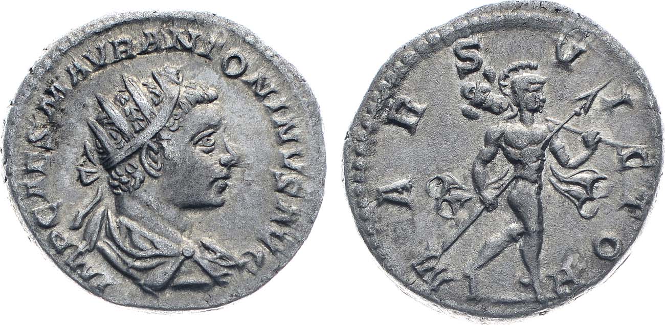 Серебро. 4,93г. Рим. Аверс: "IMP CAES M AVR ANTONINVS AVG", драпированный, лучезарный бюст Элагабала вправо. Реверс: "MARS VICTOR" Марс, идущий вправо, с копьём в правой руке и трофеем за левым плечом. BMC 19. Cohen 112. RIC 122. Thirion 39.. AU.