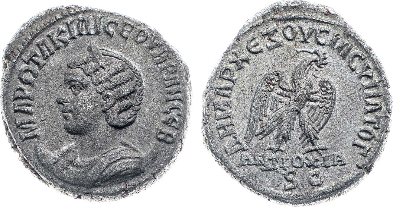 Серебро. 14,47г. Антиохия на Оронте. Отчеканена при Филиппе I. Аверс: драпированный бюст влево. Реверс: орёл с расправленными крыльями вправо, с венком в клюве; внизу "ANTIOXIA/S C". McAlee 1093. RPC VIII Online 29008. Prieur 381.. XF.