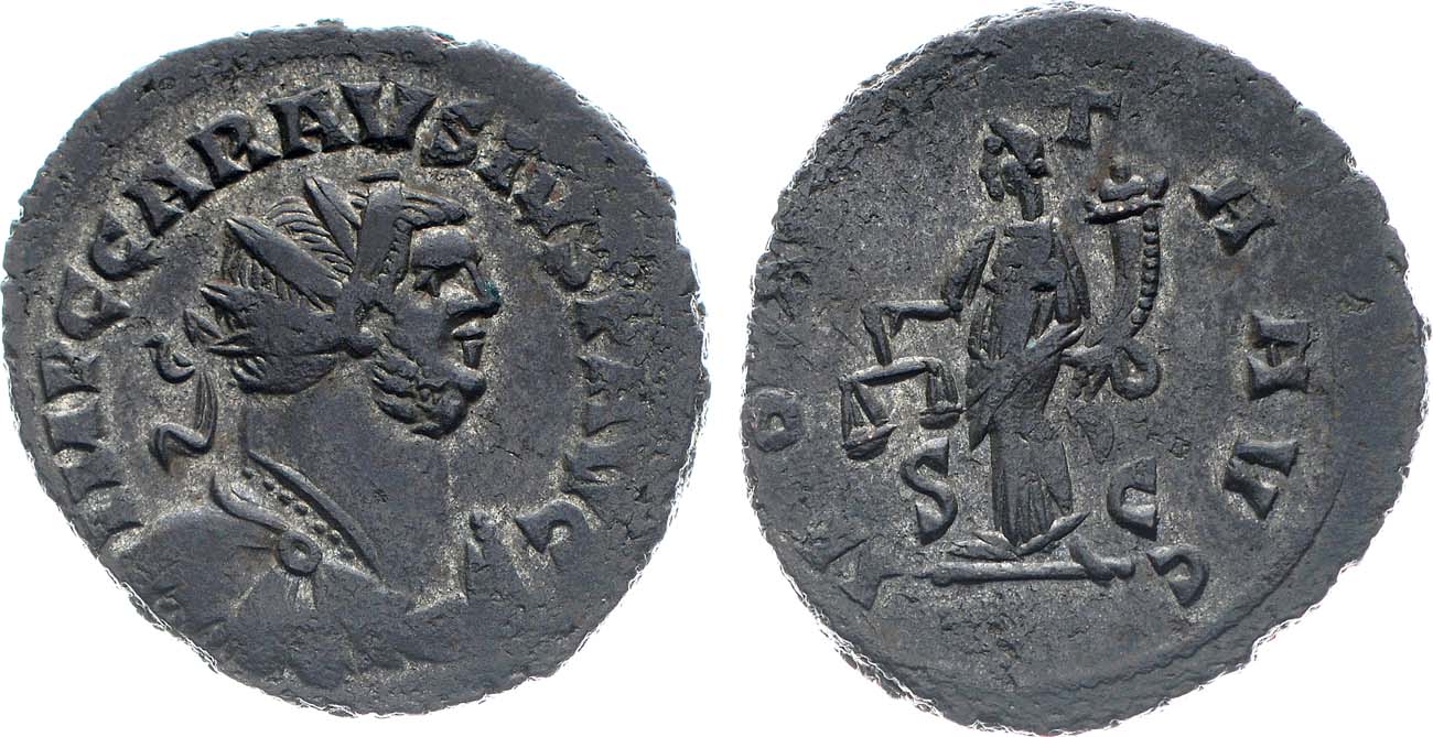 Биллон. 4,04г. Колчестер. Аверс: "IMP C CARAVSIVS P AVG" драпированный бюст императора вправо. Реверс: "MONETA AVG" Юнона влево, в правой руке весы в левой рог изобилия, "SC" в поле. Sear 13628. XF/AU.