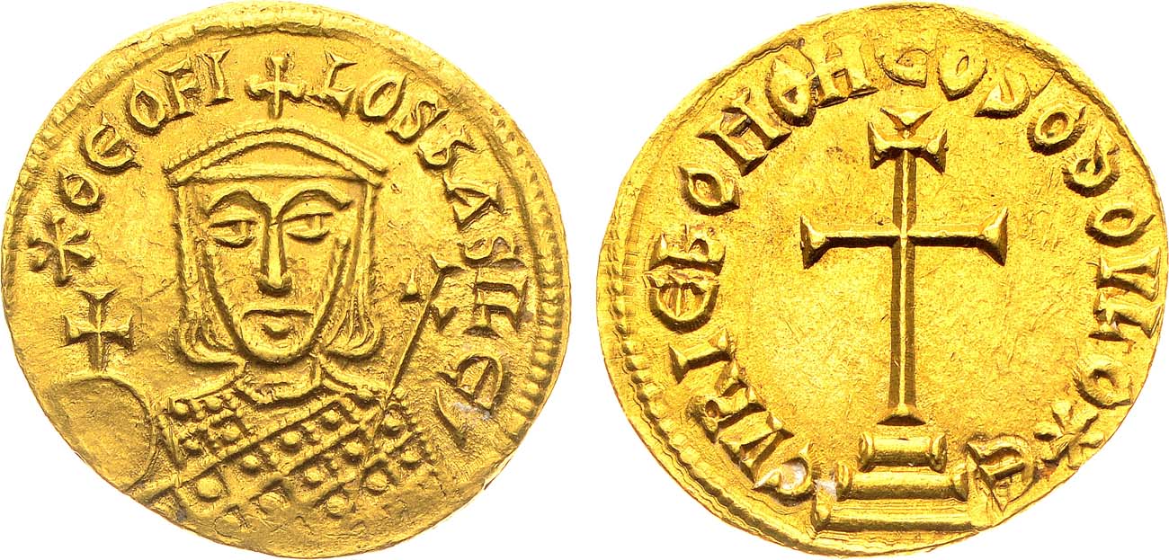 Золото. 4,37г. Константинополь. Аверс: "*ОЕОFI-LOS bASILЕ" поясной портрет Феофила анфас в короне с крестом и лоросом, в руках скипетр и держава. Реверс: "CVRIЕ bOHOHTOS O DOVLO*" большой крест на 3 ступенях, круговая легенда заканчивается на "Е". Sear 1655. Sommer 31.1. UNC.