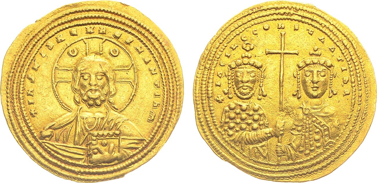 Золото. 4,41г. Аверс: круговая легенда "+IhS XIS REX REГNANTIhM"; изображение Христа с поднятой правой рукой и Евангелием - в левой. Реверс: изображение Василия II с короткой бородой и его брата Константина без бороды, держащих крест; круговая легенда "+bASIL C COhSTAhTIh b R". Sear 1800. Sommer 41.3. AU.