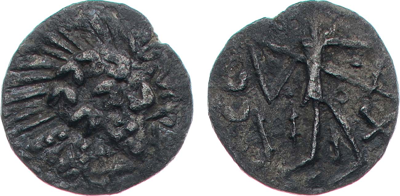 Серебро. 1,96г. Аверс: грубое схематичное изображение головы вправо. Реверс: фигура воина с копьем, слева в поле "I", справа - "X". VF.