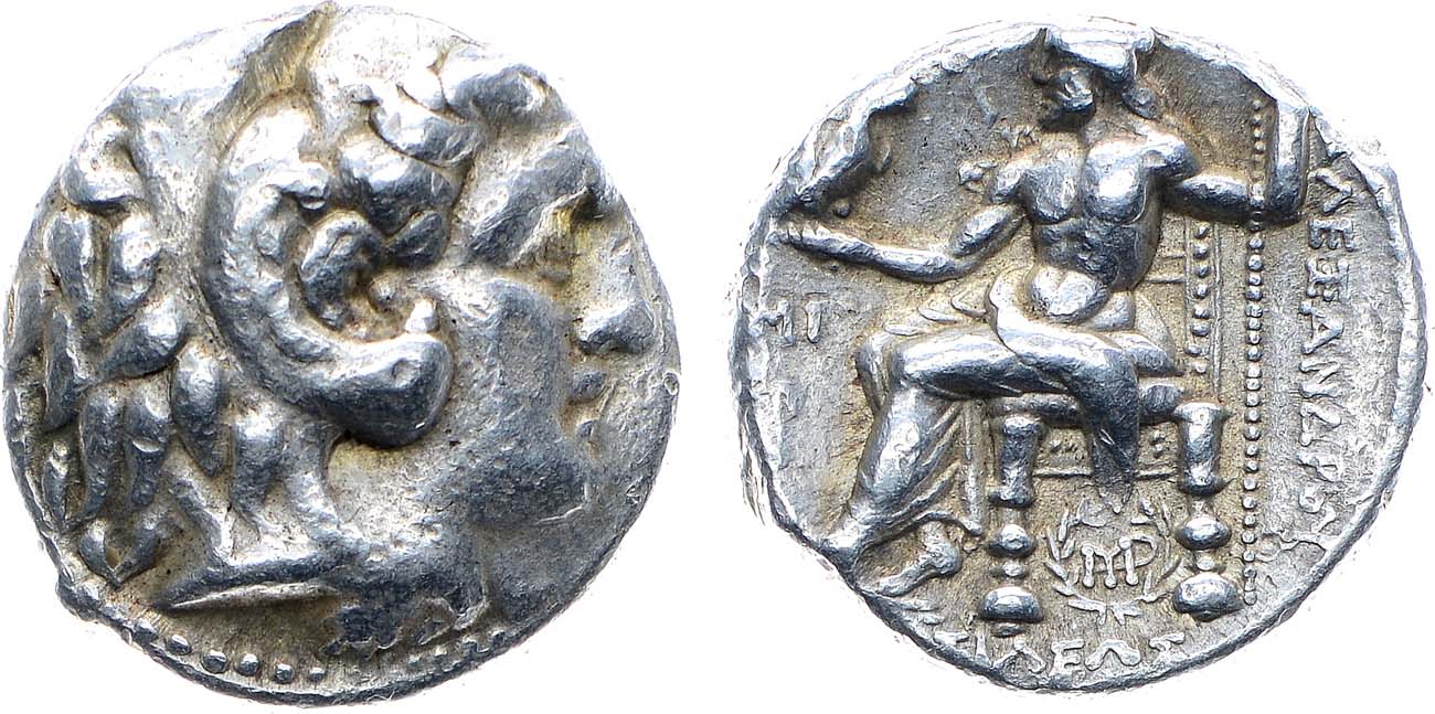 Серебро. 17,11г. Монетный двор Вавилона I. Аверс: голова Геракла в шлеме из львиной шкуры вправо. Реверс: Зевс Этофор, на троне влево и держащий скипетр; "ΒΑΣΙΛΕΩΣ" внизу, "AΛEΞANΔPOY" справа, "MI" над дубинкой в левом поле, монограмма в венке под троном. SC 82.3i. Price 3765. XF.