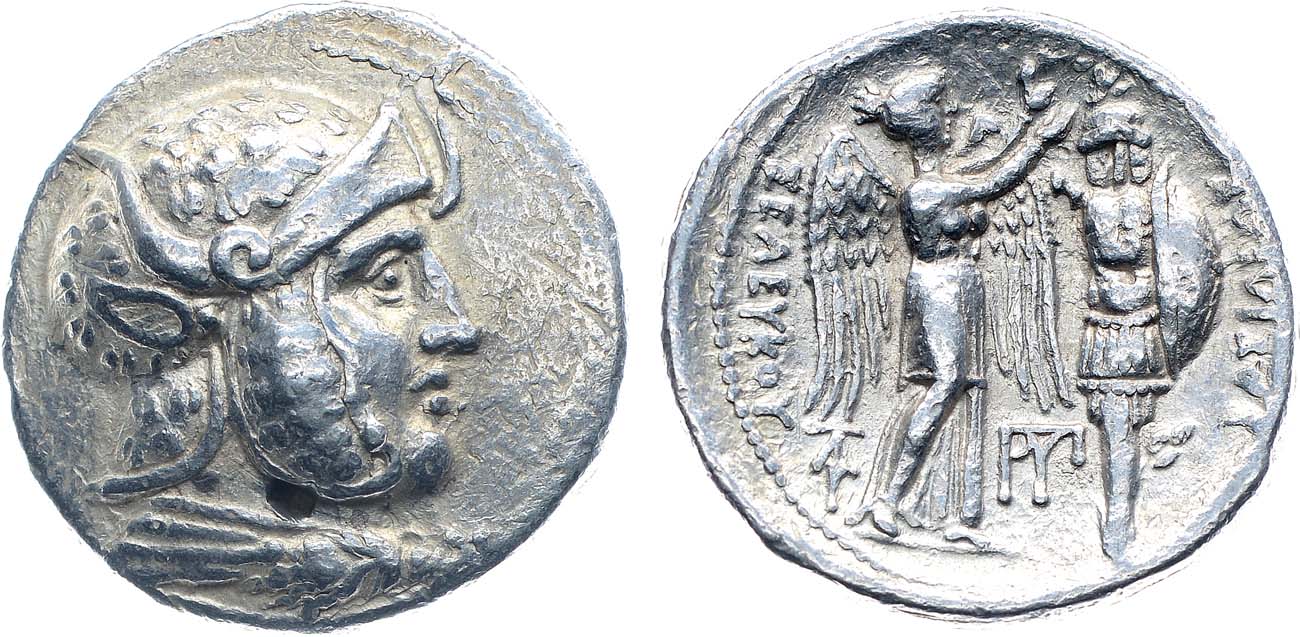 Серебро. 16,6г. Неопределенный монетный двор в Персиде (Персеполь?). Аверс: бюст Александра Македонского с чертами Селевка в образе Диониса вправо, в аттическом шлеме, покрытом шкурой пантеры и украшенном бычьим ухом и рогами, наушники опущены, а шкура пантеры повязана вокруг шеи. Реверс: "ΒΑΣΙΛΕΩΣ - ΣΕΛΕΥ ΚΟΥ" Ника, стоящая вправо, обеими руками возлагает венок на трофей из оружия справа от нее; Между Никой и трофеем, монограмма "PY". XF.