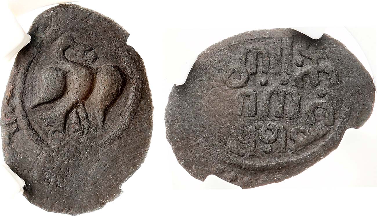 Медь. Чеканка в Коломне. Аверс: летящая птица вправо, две точки, круговая легенда. Реверс: грубое подражание легенде с именем и титулами Токтамыша. ГП2 1409 (R-III). XF det. (коррозия).