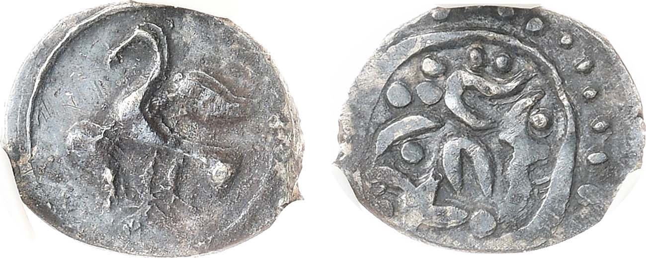 Серебро. Аверс: летящая птица влево; едва видимая круговая легенда. Реверс: подражание. ГП2 1565 (R-VII). XF.