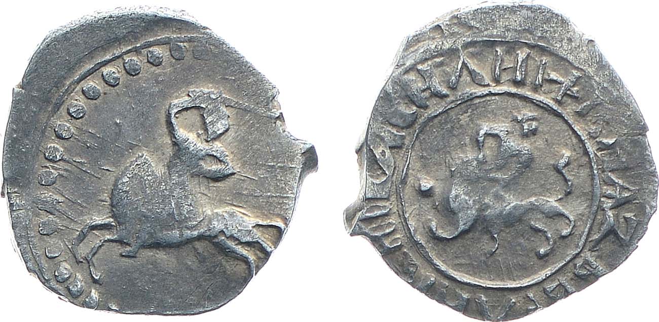 Серебро. 0,66г. Аверс: Самсон, борющийся со львом, влево; круговая легенда с именем князя Василия Дмитриевича. Реверс: всадник влево с занесённым мечом; круговой точечный ободок. ГП2 1750B (R-V). AU.