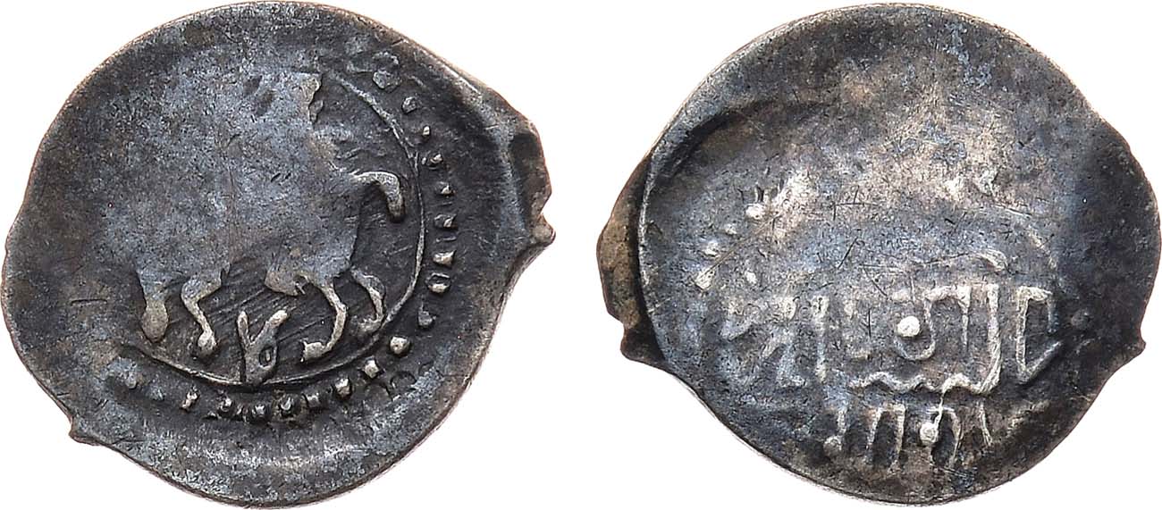 Серебро. 0,66г. Аверс: всадник с соколом вправо, под всадником голова змеи пастью вверх; точечный ободок с кольцом. Реверс: стилизованное подражание арабской легенде в очечном ободке. ГП2 1767B (R-VIII). AU.