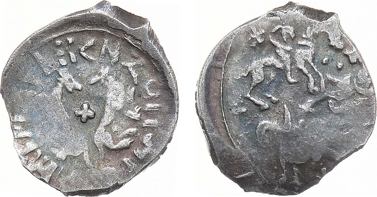 Серебро. 0,46г. Аверс: звери на задних лапах, крест между ними, круговая легенда ":КNZ ONДРѢН ДМТРЄВVЬ". Реверс: всадники, ряд крестов в поле, дракон под всадниками. ГП2 3692 (R-III). AU.