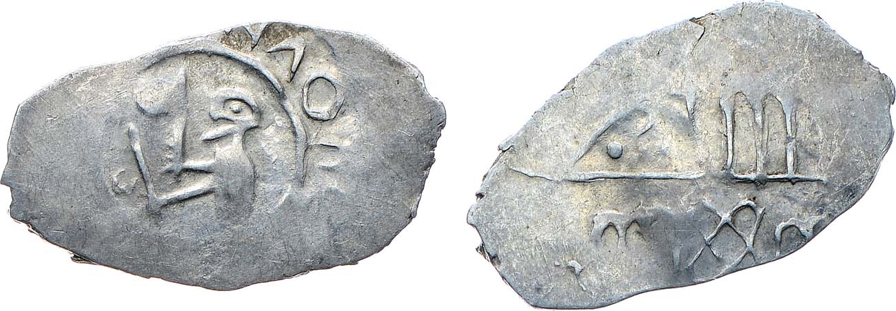 Серебро. 0,88г. Суздаль. Аверс: воин с мечом и топором влево. Реверс: подражание арабской надписи. ГП2 4112А (R-IV). XF.