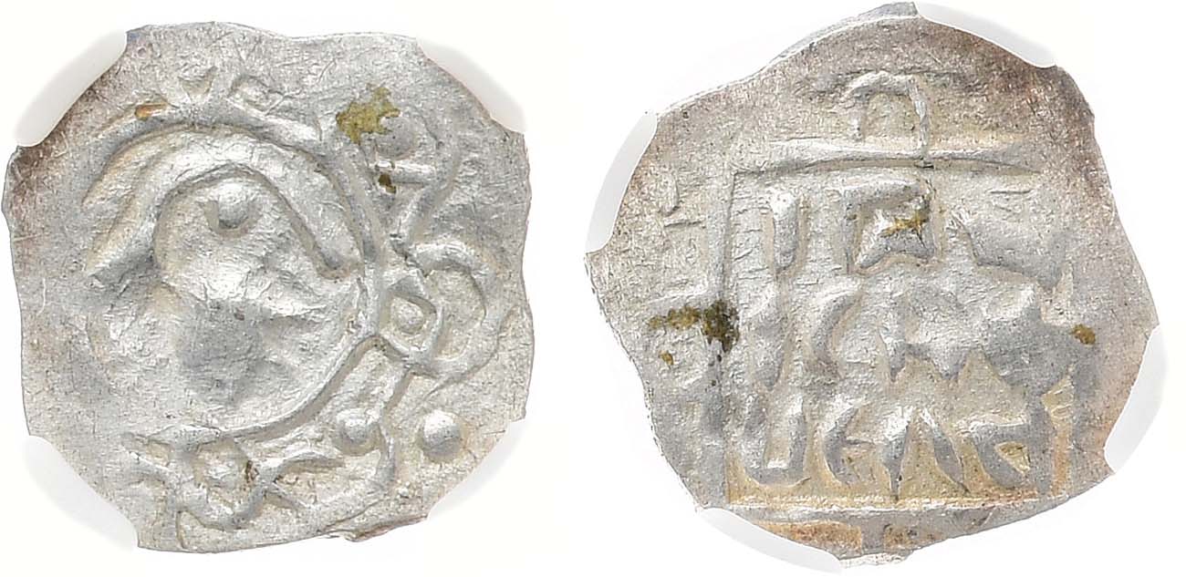 Серебро. Аверс: зеркальная русская строчная легенда в квадратной рамке, к каждой из которой примыкают полукруги. Реверс: голова вправо в круге - в картуше с четырьмя узлами счастья и четырьмя точками. ГП2 4507D (R-III). AU 55.