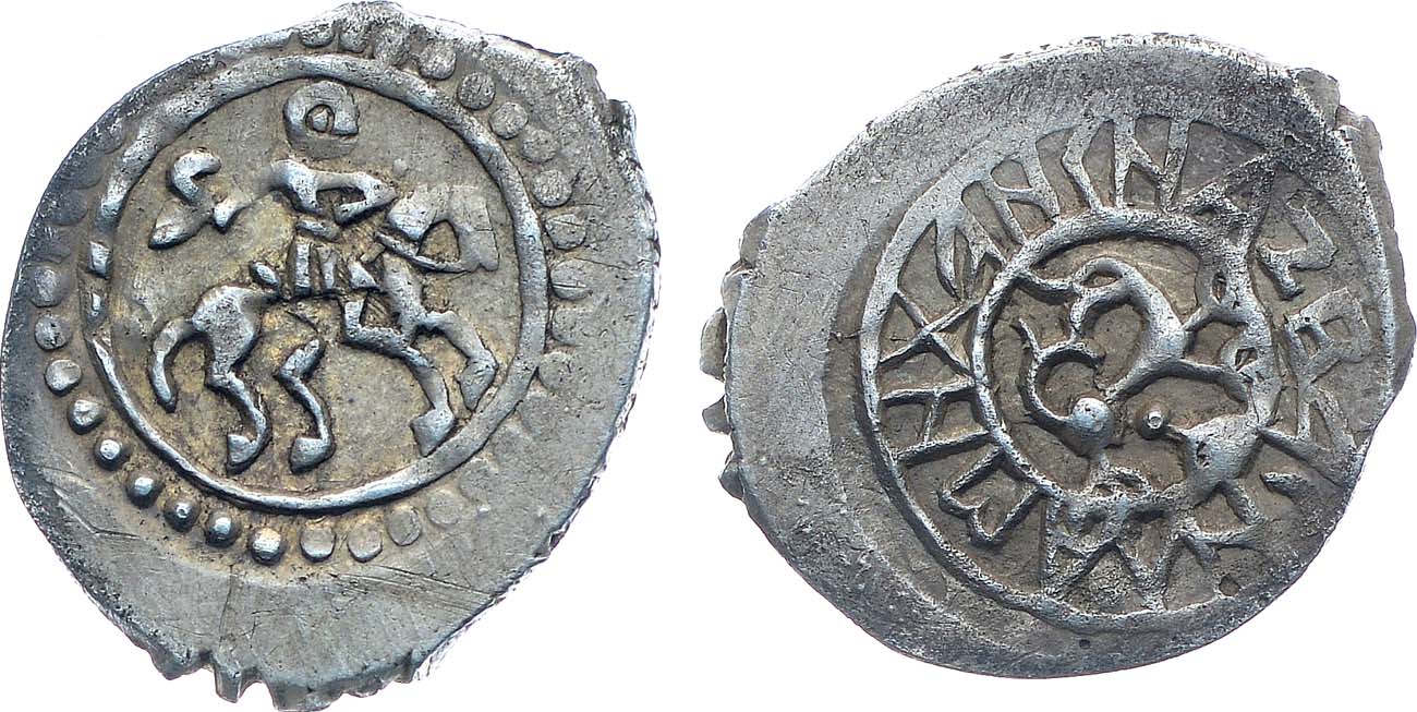 Серебро. 0,64г. Аверс: всадник вправо с соколом в правой руке. Реверс: четвероногое вправо, круговая надпись : "КНЯЗЯ ВАСИЛИЯ МИХАЙЛОВИЧА". ГП2 7420 (R-I). AU.