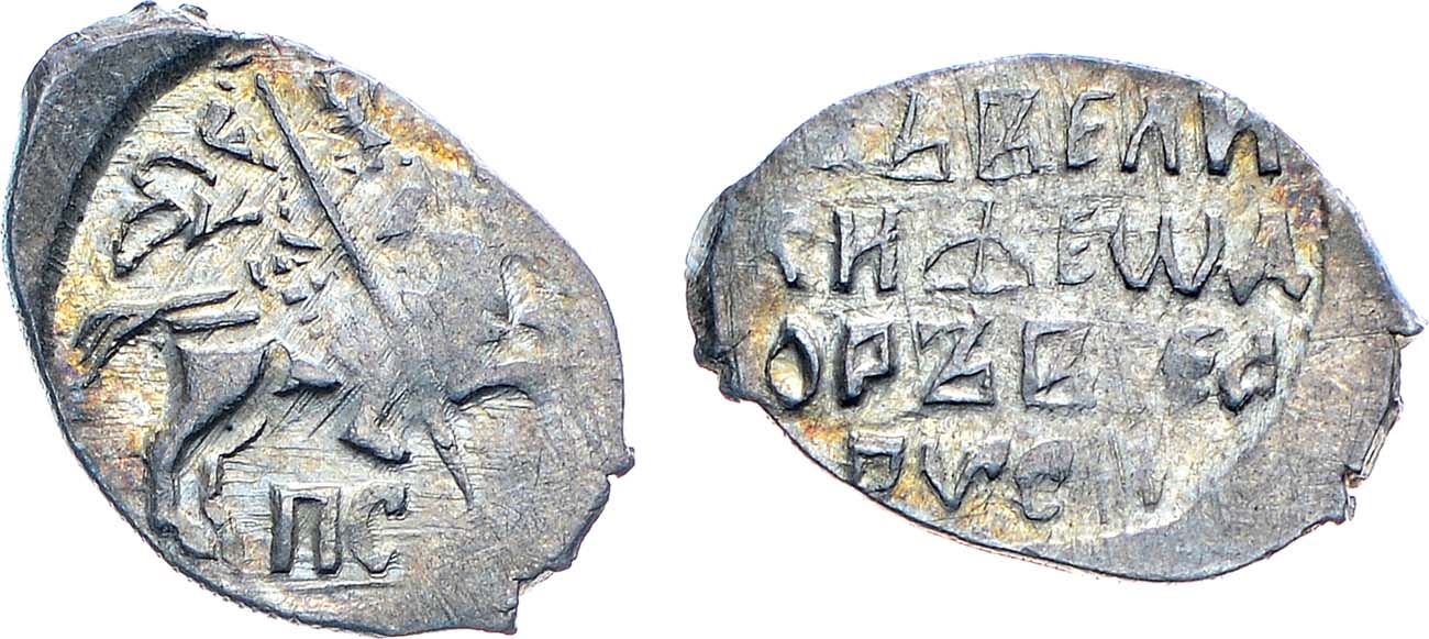 Серебро. 0,65г. Монетный двор Пскова. Реверс: "ПС" под всадником. ГКХ2 143. UNC.