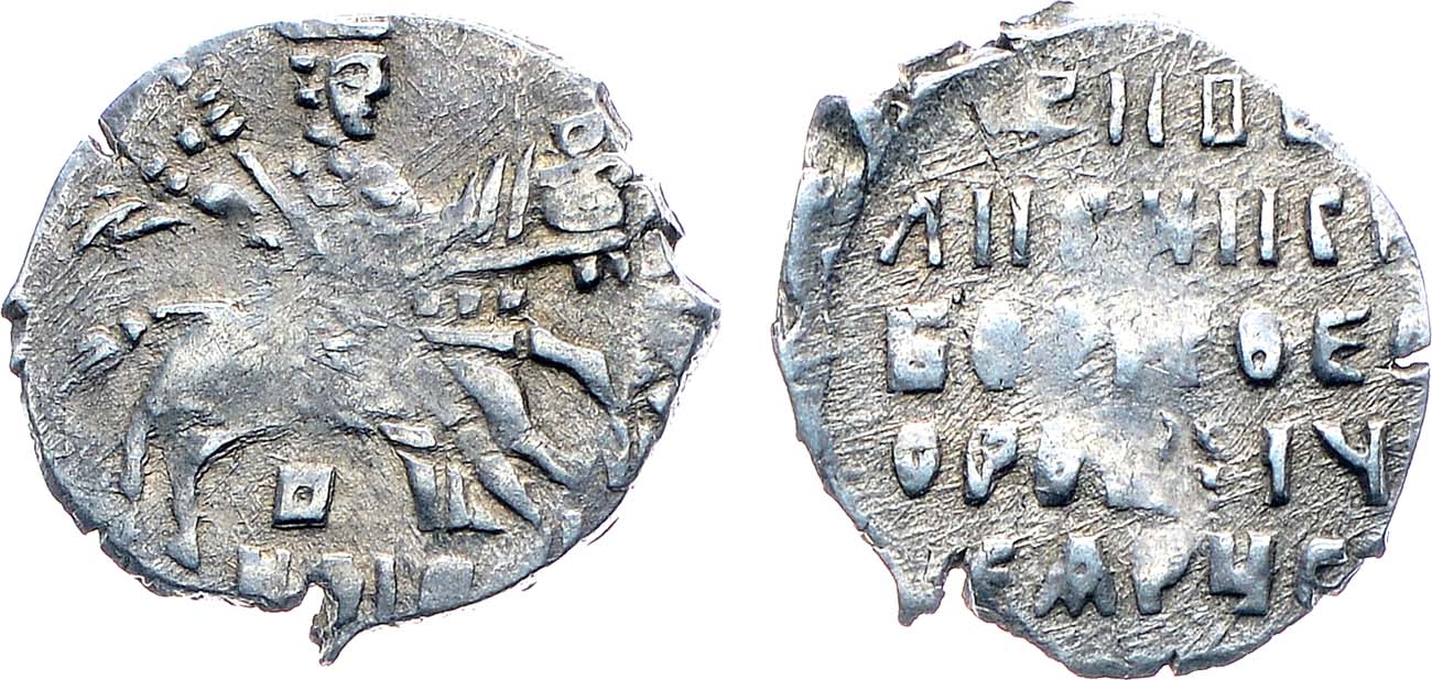 Серебро. 0,65г. Монетный двор Новгорода. Реверс: "В/НОI" и дати "РИ" (1600) под всадником. ГКХ2 219. AU.