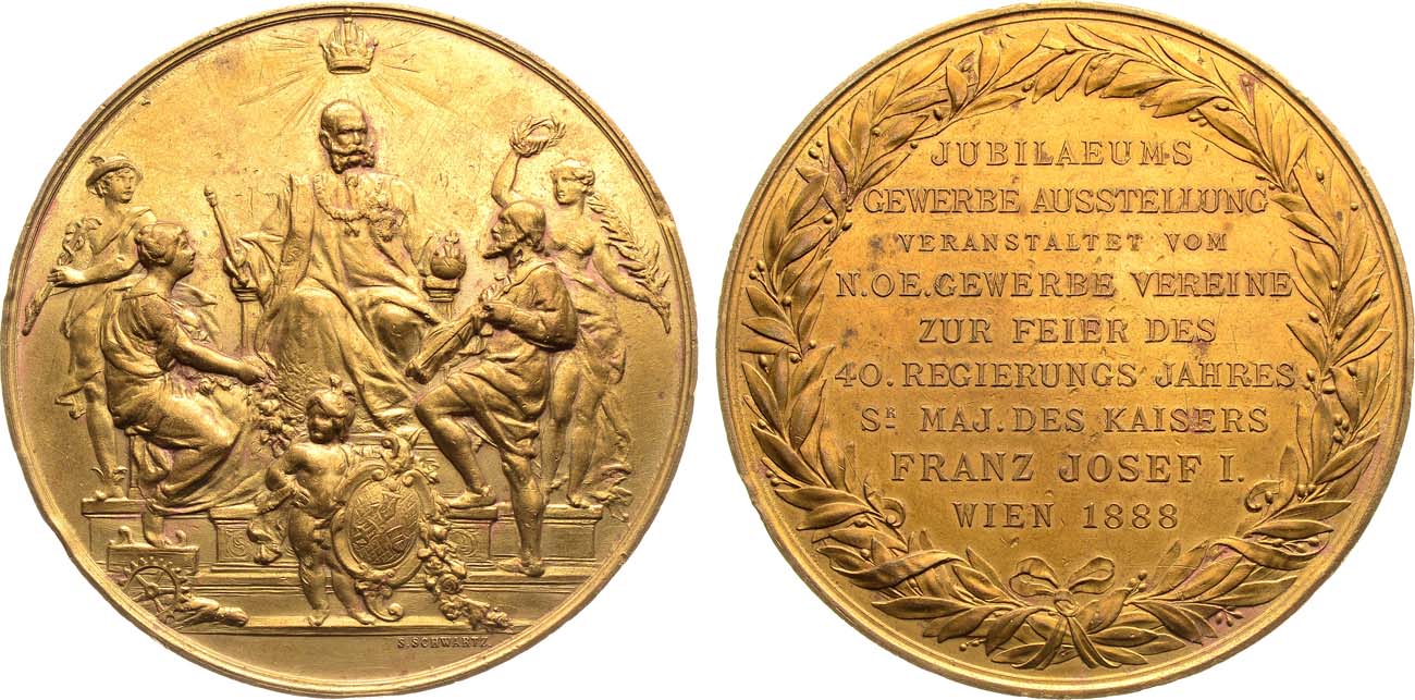 Бронза золочение. 81,88г. Диаметр 64 мм. Австрия. Вена. Медальер Шварц (на аверсе справа под линией обреза "S. SCHWARTZ."). AU.