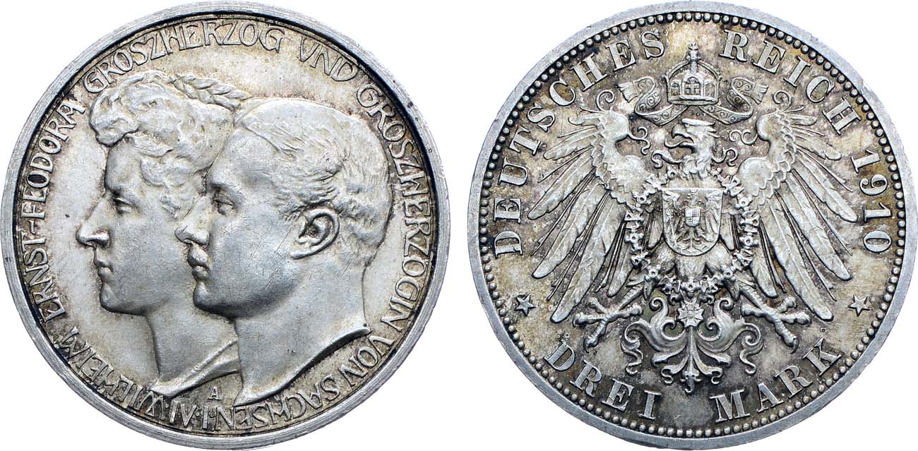 Серебро. 16,7г. Берлин (А). Тираж: 133000 экз. Отчеканена в память свадьбы герцога Вильгельма и Феодоры. KM 221. Jaeger 162. Weege 158.. AU.