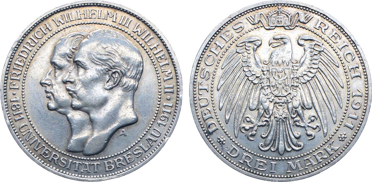 Серебро. 16,66г. Берлин (А). Тираж: 400000 экз. Отчеканена в память 100-летия Университета Бреслау. KM 531. Jaeger 108. Weege 108.. AU.
