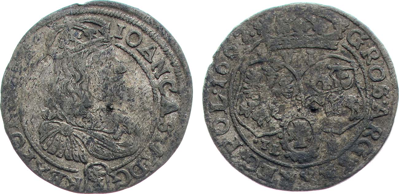 Серебро. 2,84г. Быдгош (TLB). Аверс: "IOAN CAS D G RE X POL & S M D". Реверс: "GROS ARG SEX REG POL 1667". Kopicki 1688(R). VF.