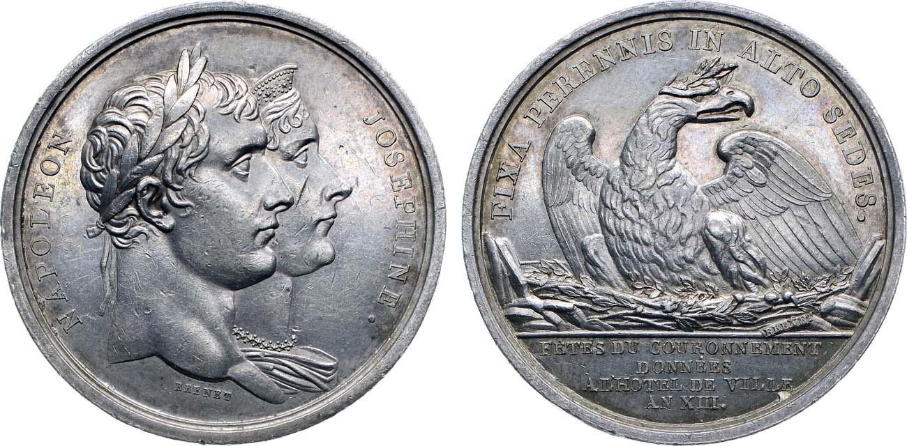 Серебро. 20,45г. Диаметр 35 мм. Парижский монетный двор. Медальер Н.-Г. Брене (на аверсе под бюстами "BRENET", на реверсе справа над линией обреза "BRENET"). Bramsen 359. AU/UNC.